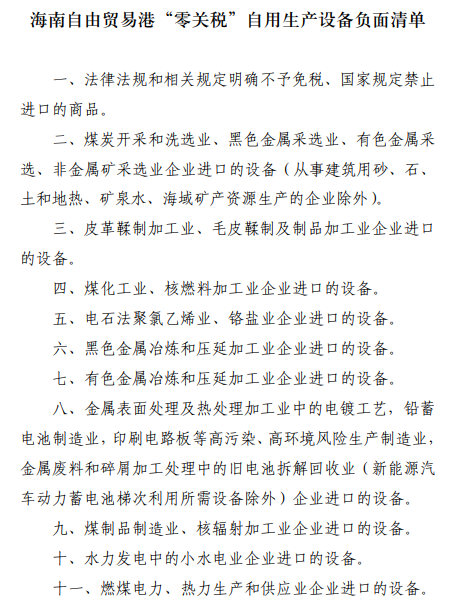 附件:海南自由贸易港“零关税”自用生产设备负面清单