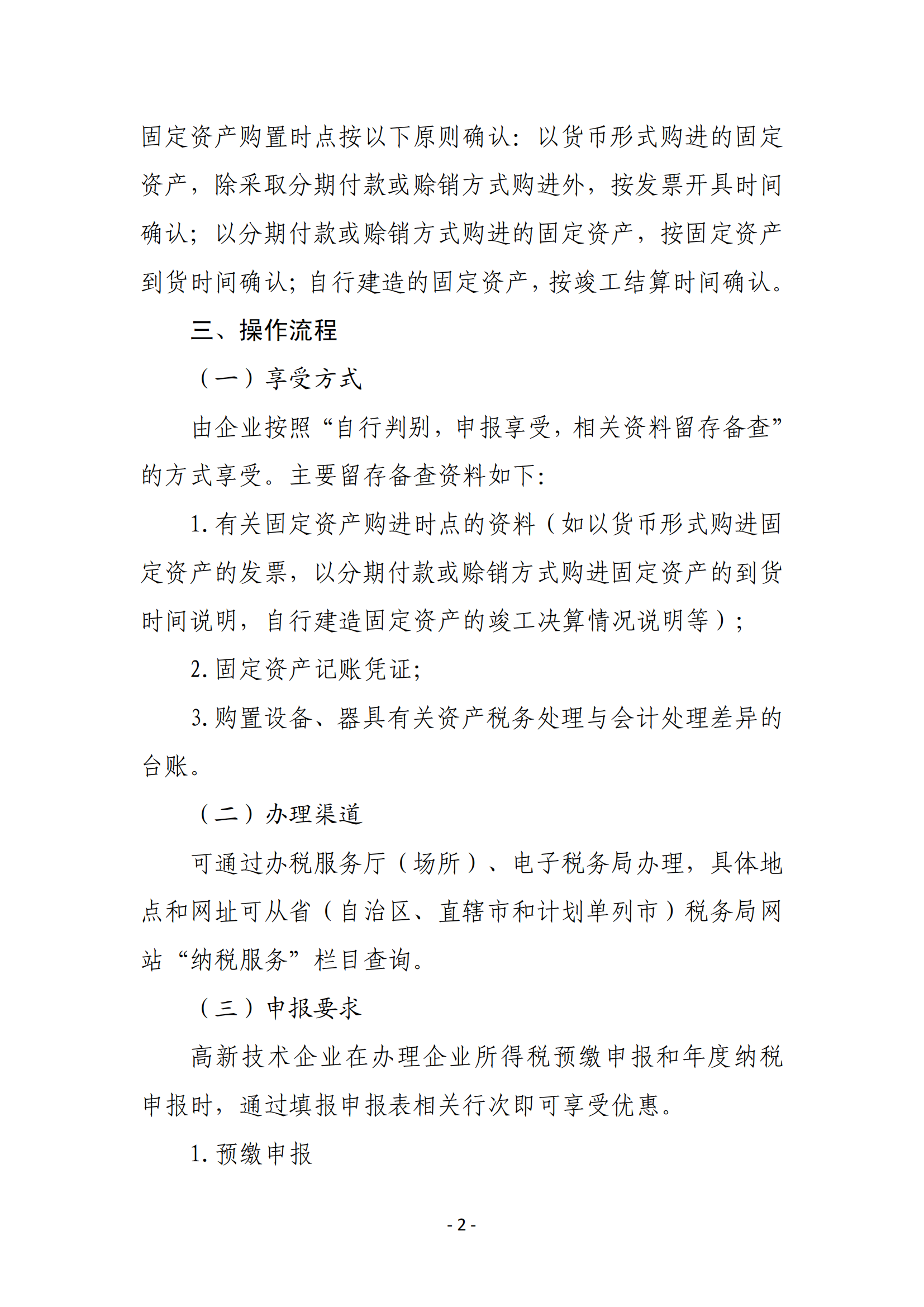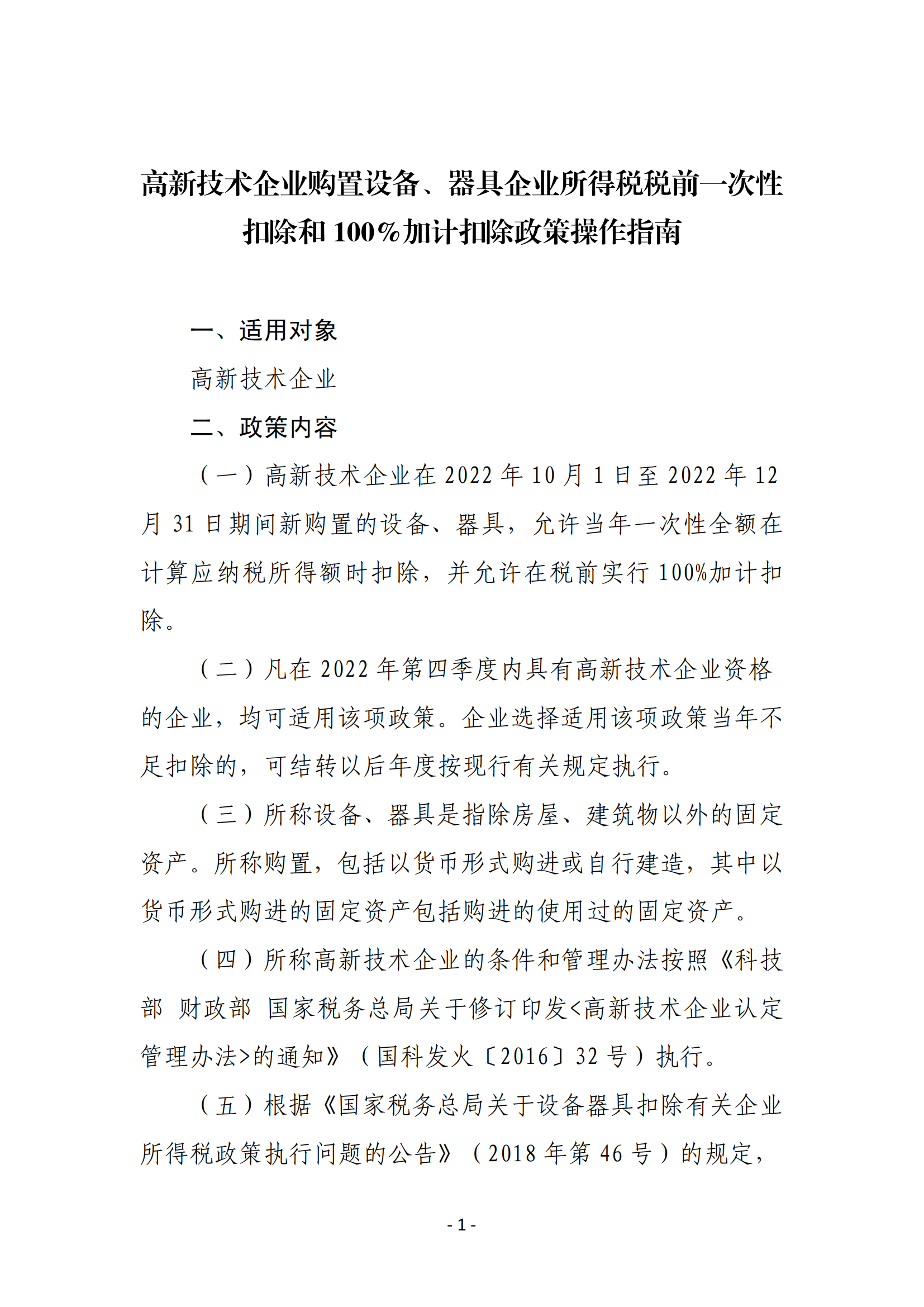 高新技术企业购置设备、器具企业所得税税前一次性扣除和 100%加计扣除政策操作指南