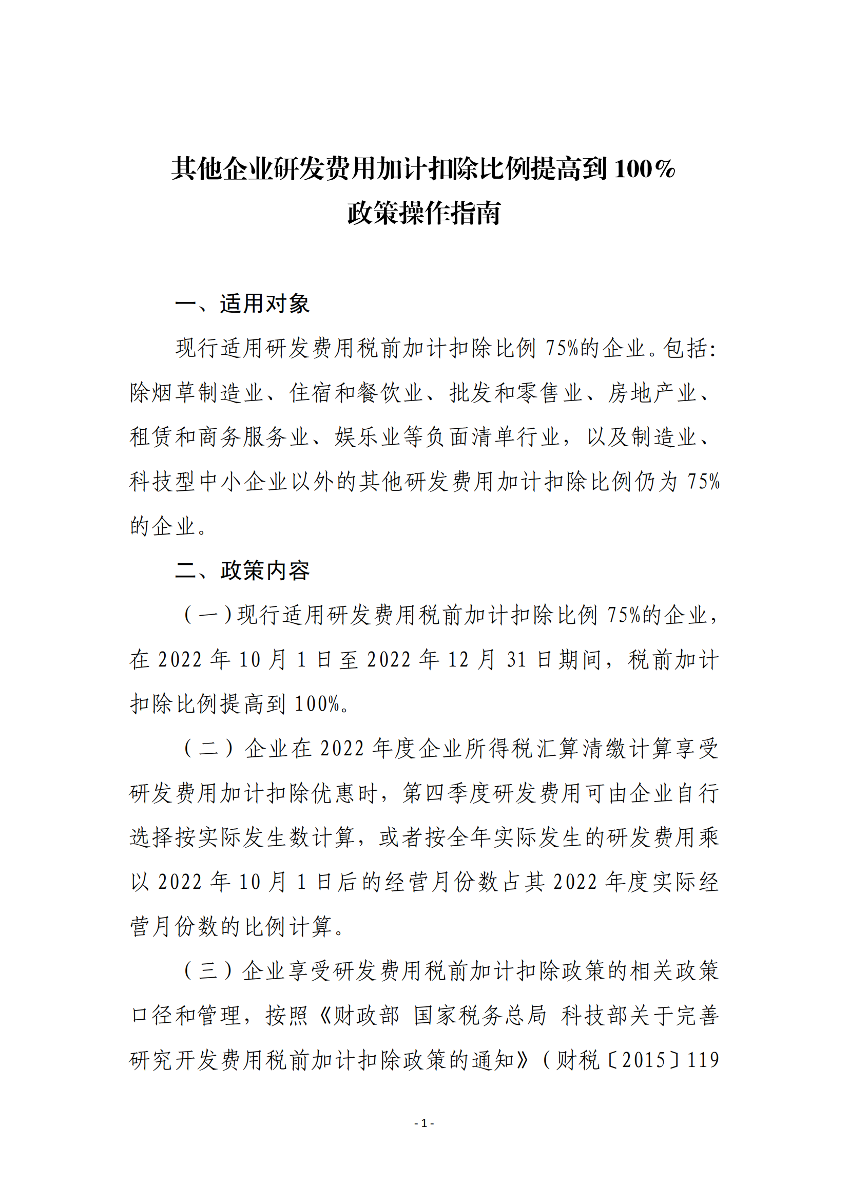 其他企业研发费用加计扣除比例提高到100%政策操作指南