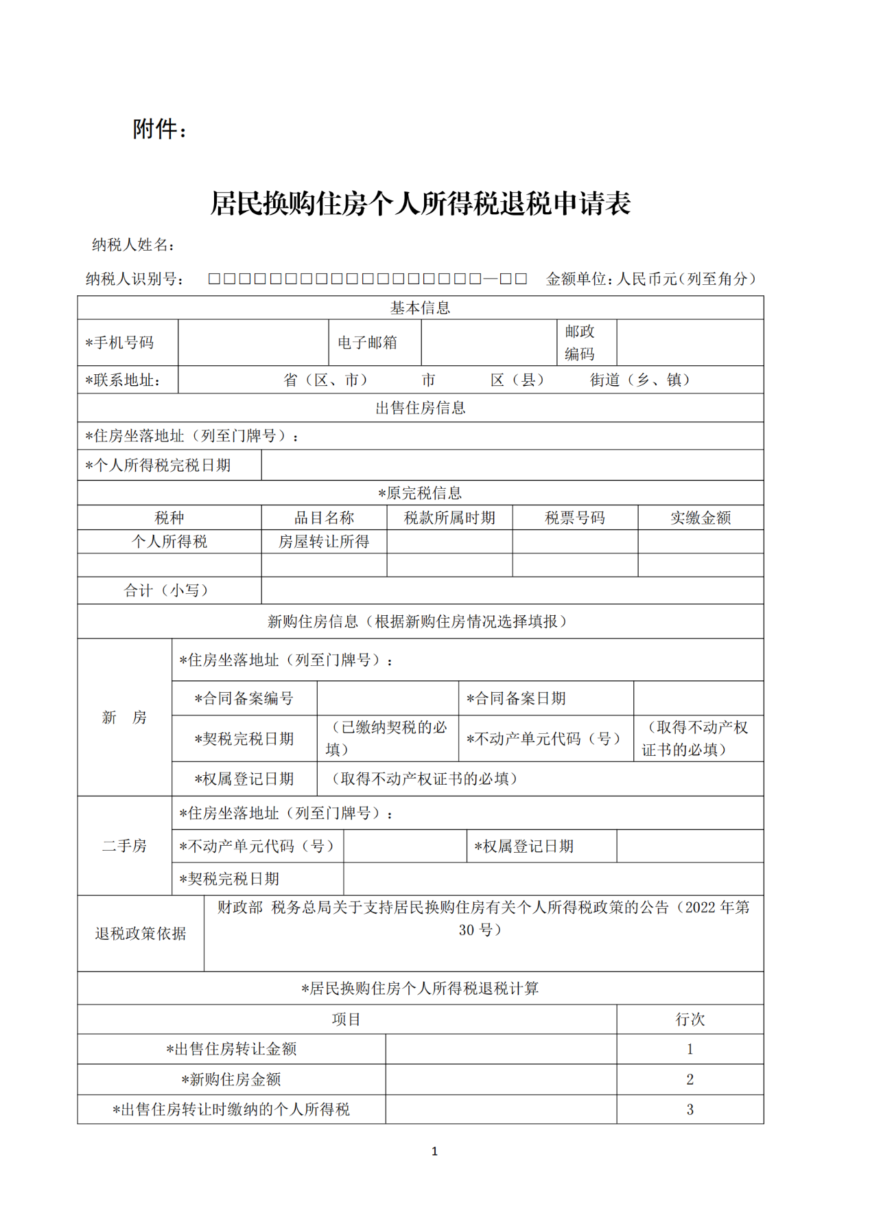 五、纳税人享受居民换购住房个人所得税退税政策的,应当向征收现住房转让所得个人所得税的主管税务机关提出申请,填报《居民换购住房个人所得税退税申请表》(详见附件),并应提供下列资料: