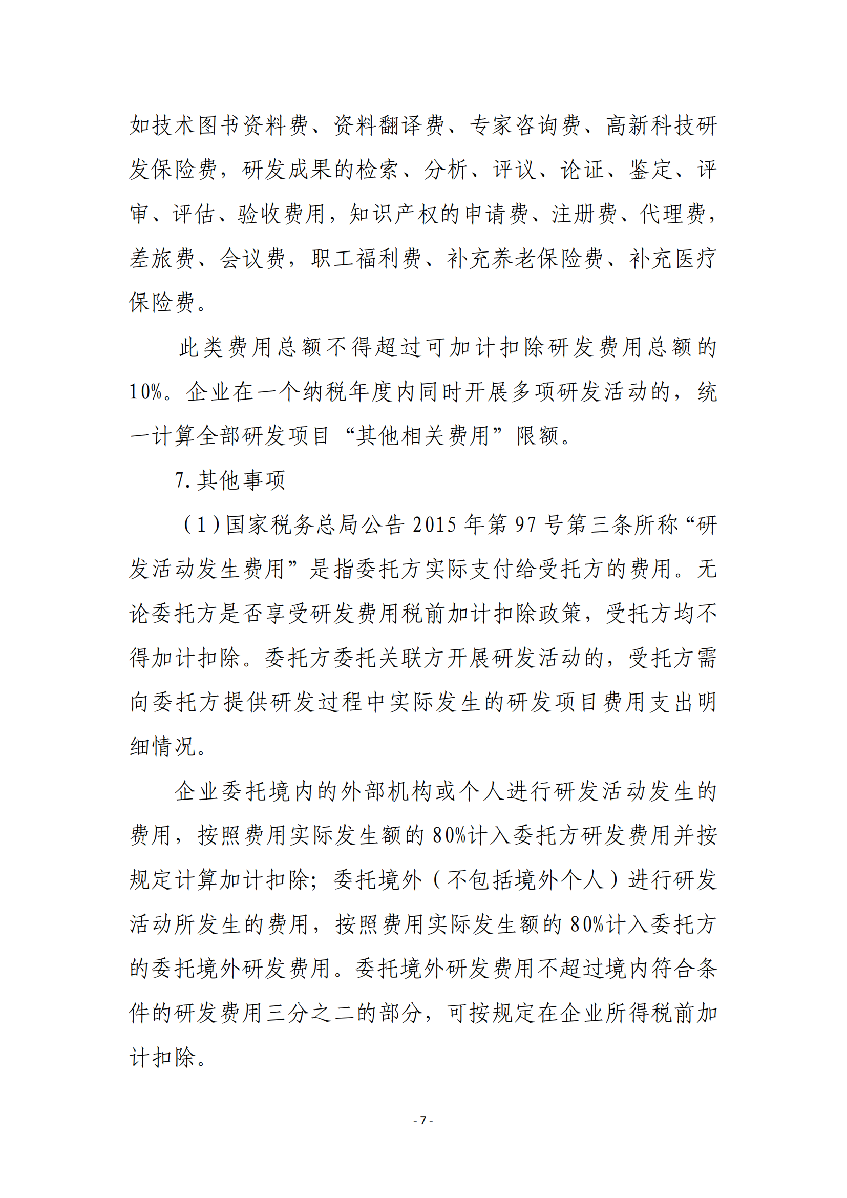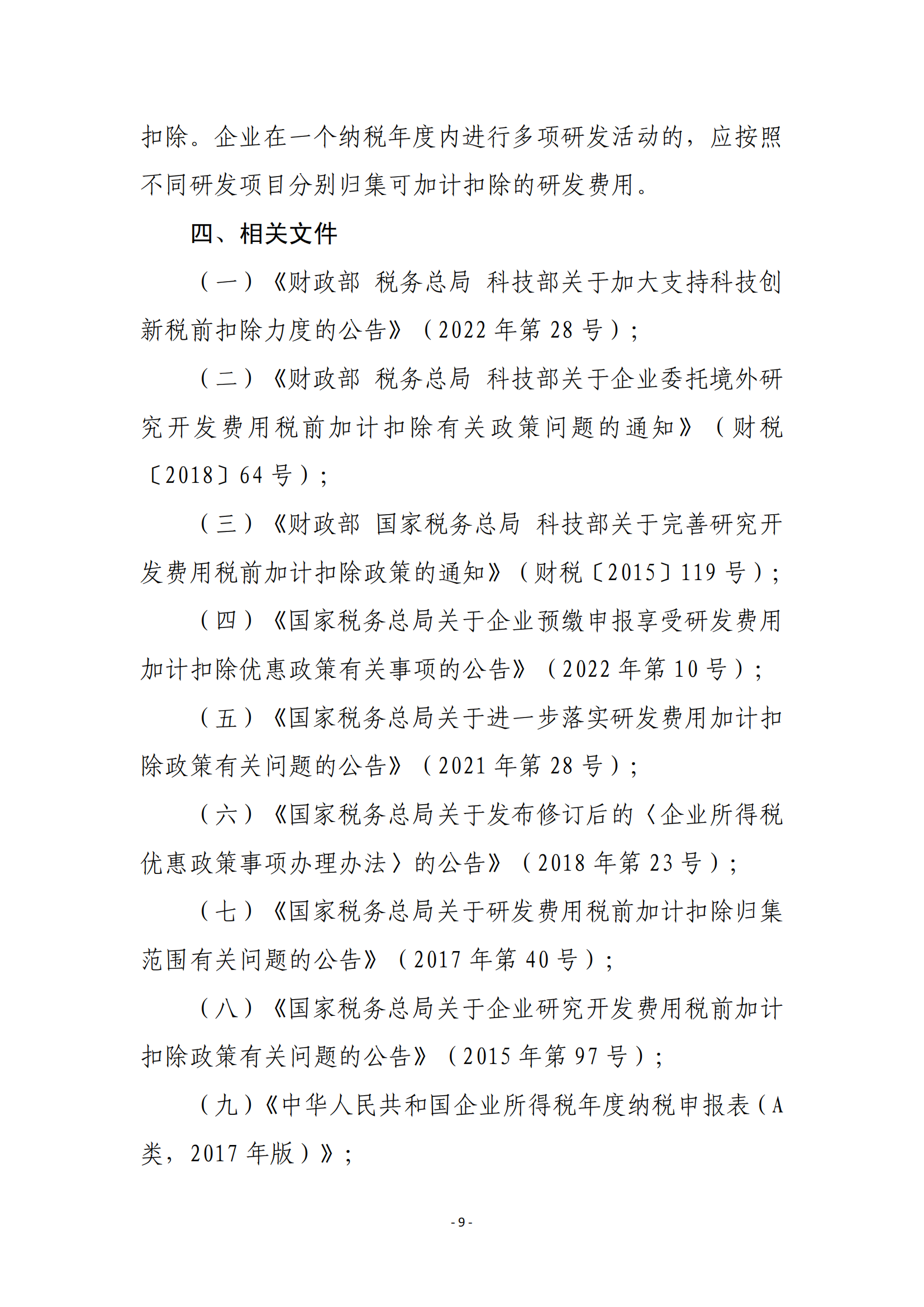 企业享受研发费用税前加计扣除政策的相关政策口径和管理,按照《财政部 国家税务总局 科技部关于完善研究开发费用税前加计扣除政策的通知》(财税〔2015〕119号)、《财政部 税务总局 科技部关于企业委托境外研究开发费用税前加计扣除有关政策问题的通知》(财税〔2018〕64号)等文件相关规定执行。