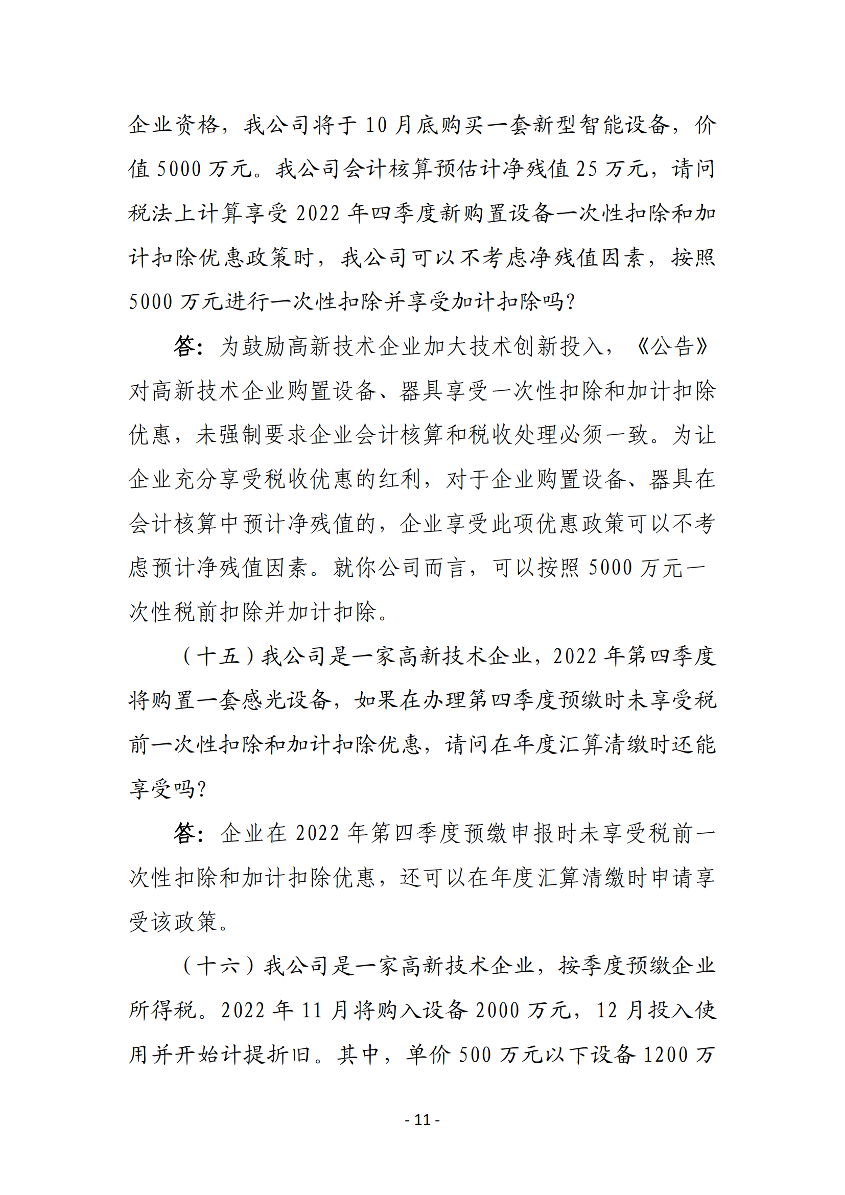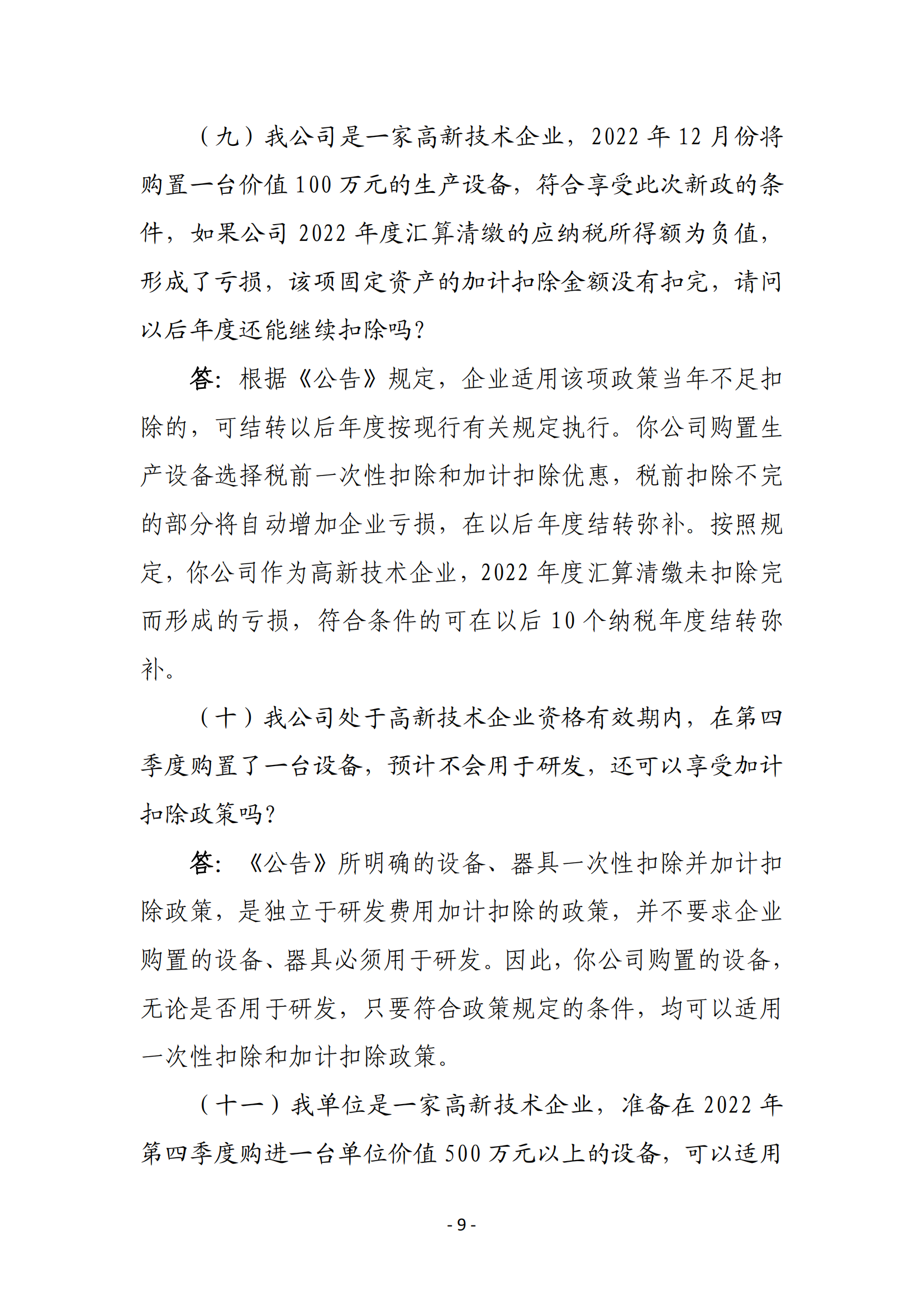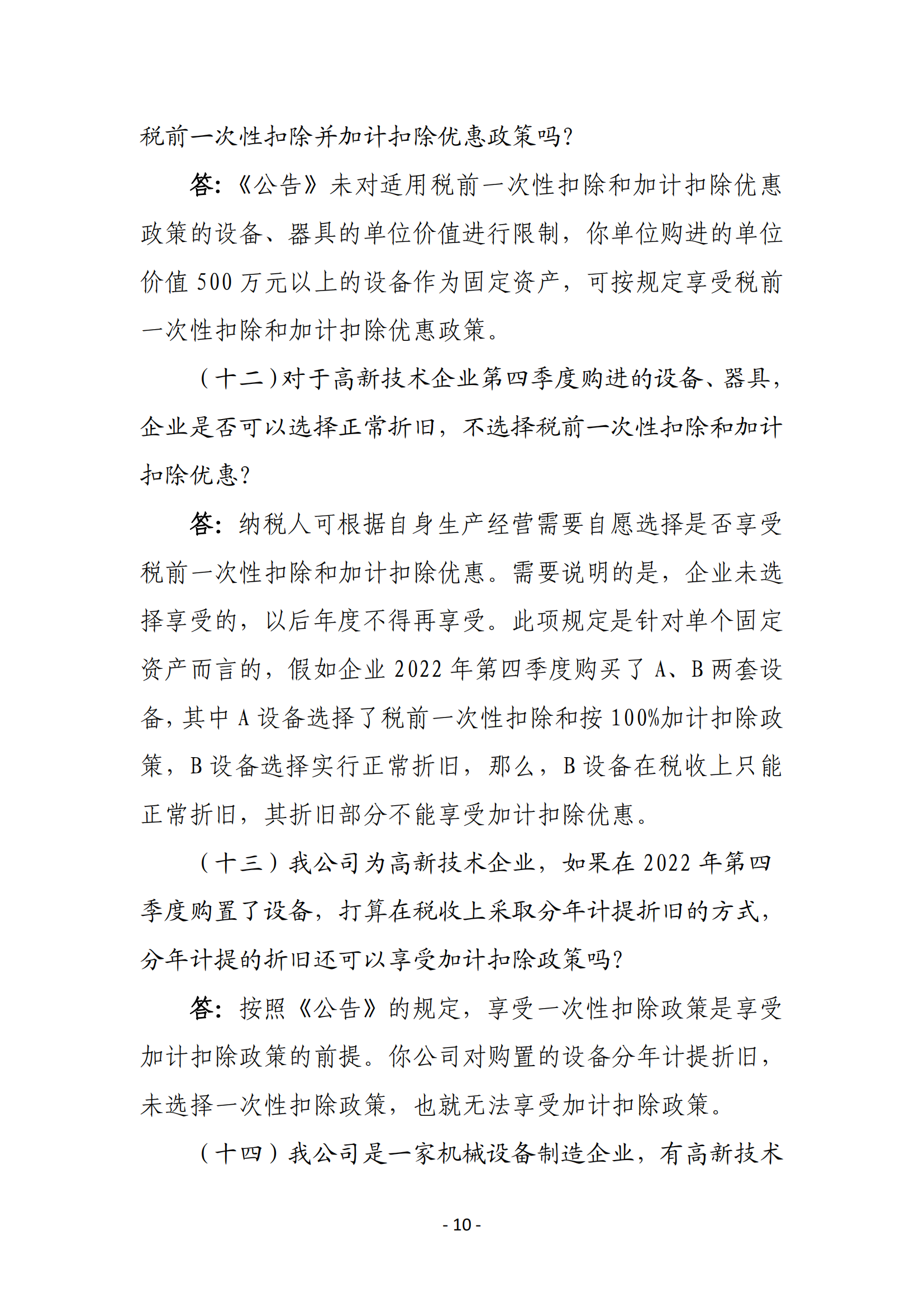 一、高新技术企业在2022年10月1日至2022年12月31日期间新购置的设备、器具,允许当年一次性全额在计算应纳税所得额时扣除,并允许在税前实行100%加计扣除。