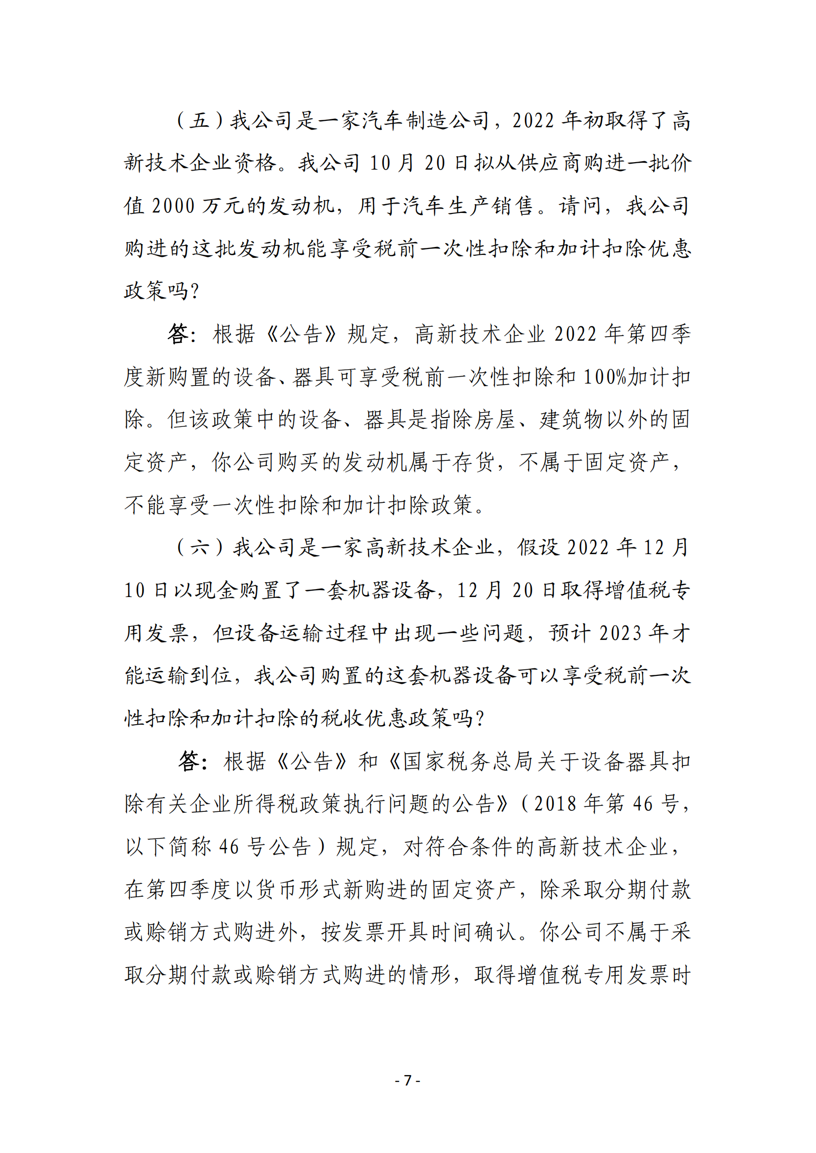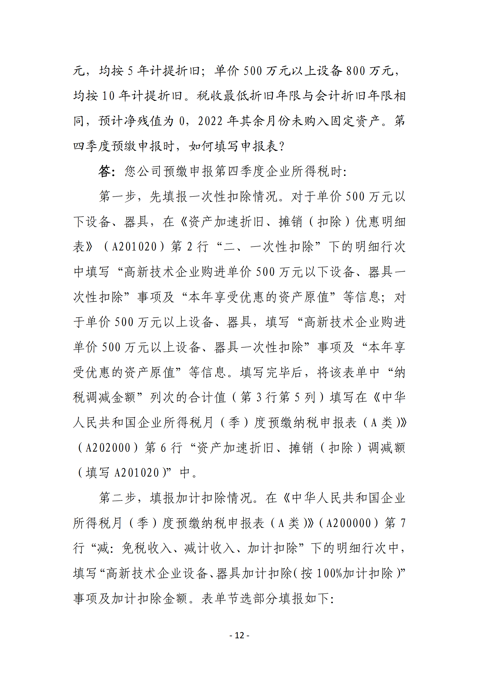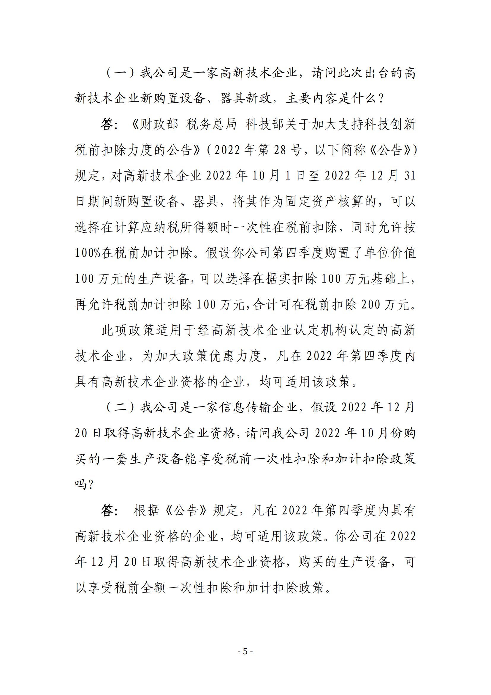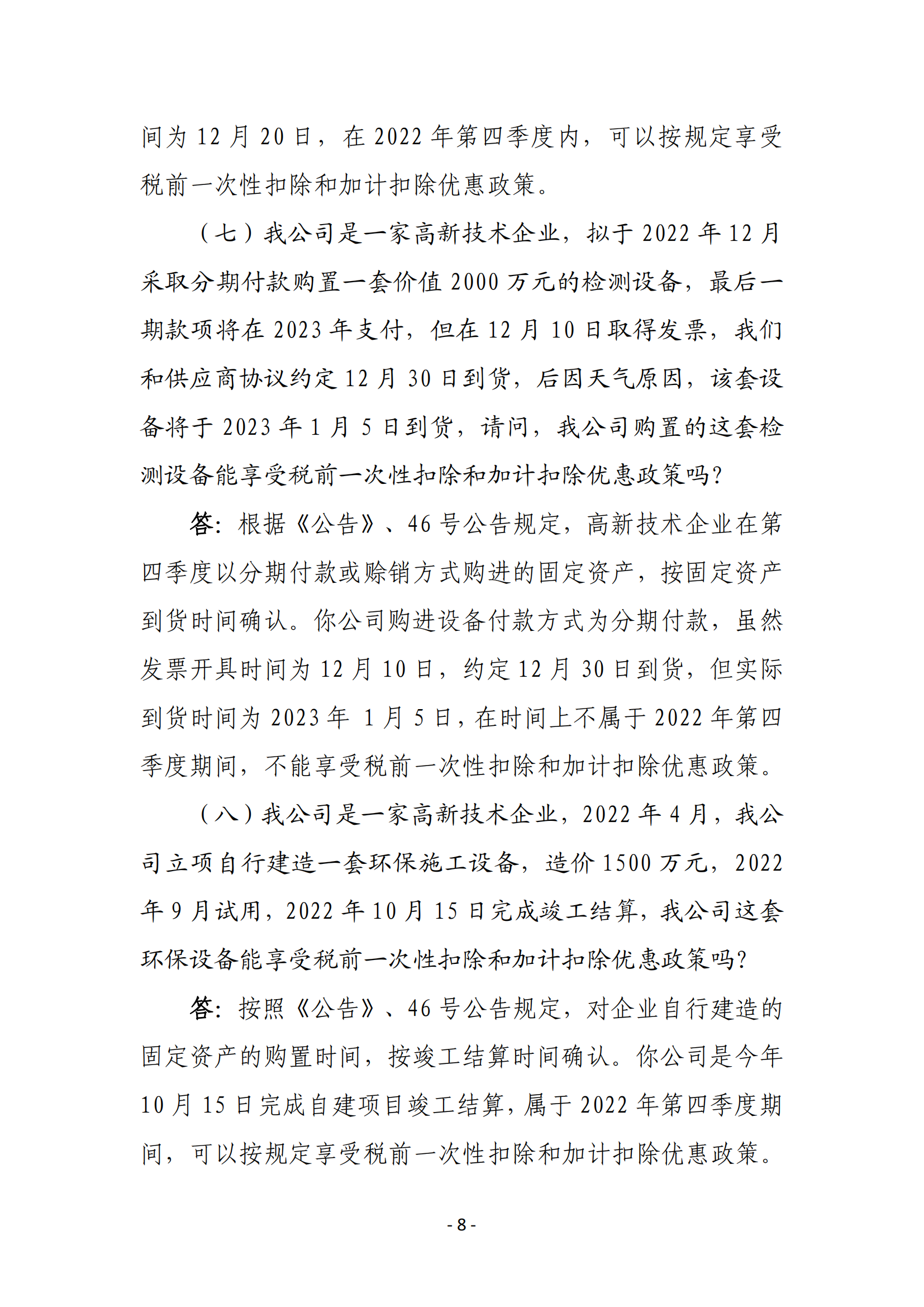 一、高新技术企业在2022年10月1日至2022年12月31日期间新购置的设备、器具,允许当年一次性全额在计算应纳税所得额时扣除,并允许在税前实行100%加计扣除。
