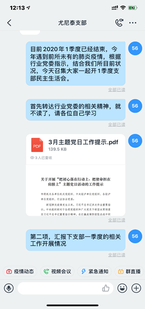 3月31日上午,根据上海市市级机关工作党委基层组织建设指导部下发的《关于开展“把初心落在行动上、把使命担在肩膀上”主题党日活动的工作提示》,一场“特殊”的主题党日活动在尤尼泰(上海)税务师事务所党支部举行。党支部通过钉钉平台开展“把初心落在行动上、把使命担在肩膀上”主题党日活动。主要通过“线上”专题学习,进一步深入学习、全面贯彻落实习近平总书记重要讲话和指示批示精神,及时学习领会市委关于疫情防控不松劲、复工复产复市要加快、城市安全运行要确保等部署要求,把党中央和市委的各项决策部署抓实抓细抓落地。各位党员在钉钉平台交流意见,发表学习心得。
